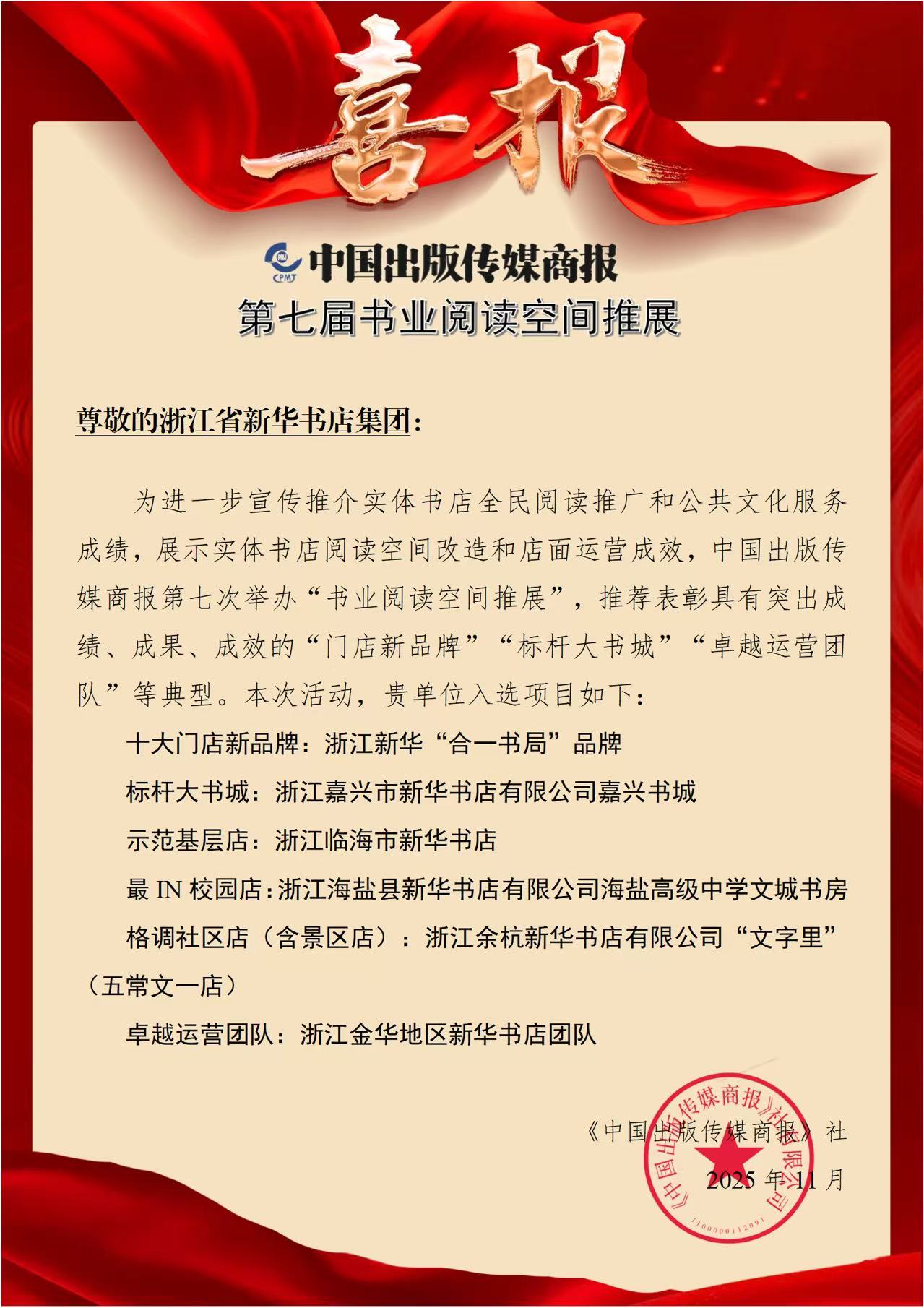 浙江新华荣获“第七届书业榜样阅读空间”六项奖项