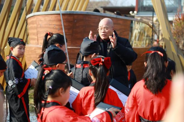 仪式结束后,中国作家协会会员、海盐县作家协会主席吴松良作为特邀嘉宾,为“秦溪文化探索队”授旗,并担任研读环节向导,全体齐诵口号:“读万卷书,明礼启智;行万里路,探脉家乡!”随后,孩子们手持“探秘秦溪知行记录卡”,从室内走向乡土,开启了实地探索之旅。