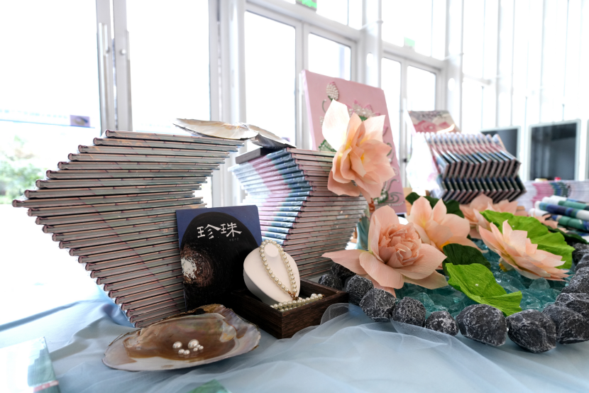 《珍珠》绘本主题区:以半开的蚌壳为主体,内嵌温润发光的珍珠,背景辅以青绿山水,西施与河蚌姑娘的形象跃然其间。“以蚌为怀,以珠为盟,传承非遗,守护真情”——观众在这里触摸东方传说的现代魅力,拍下最具仙气的亲子合影。